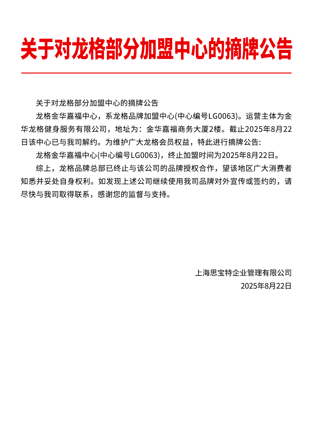 27、龙格金华嘉福中心,系龙格品牌加盟中心(中心编号LG0063)。运营主体为金华龙格健身服务有限公司,地址为金华嘉福商务大厦2楼,终止加盟时间为2025年8月22日。