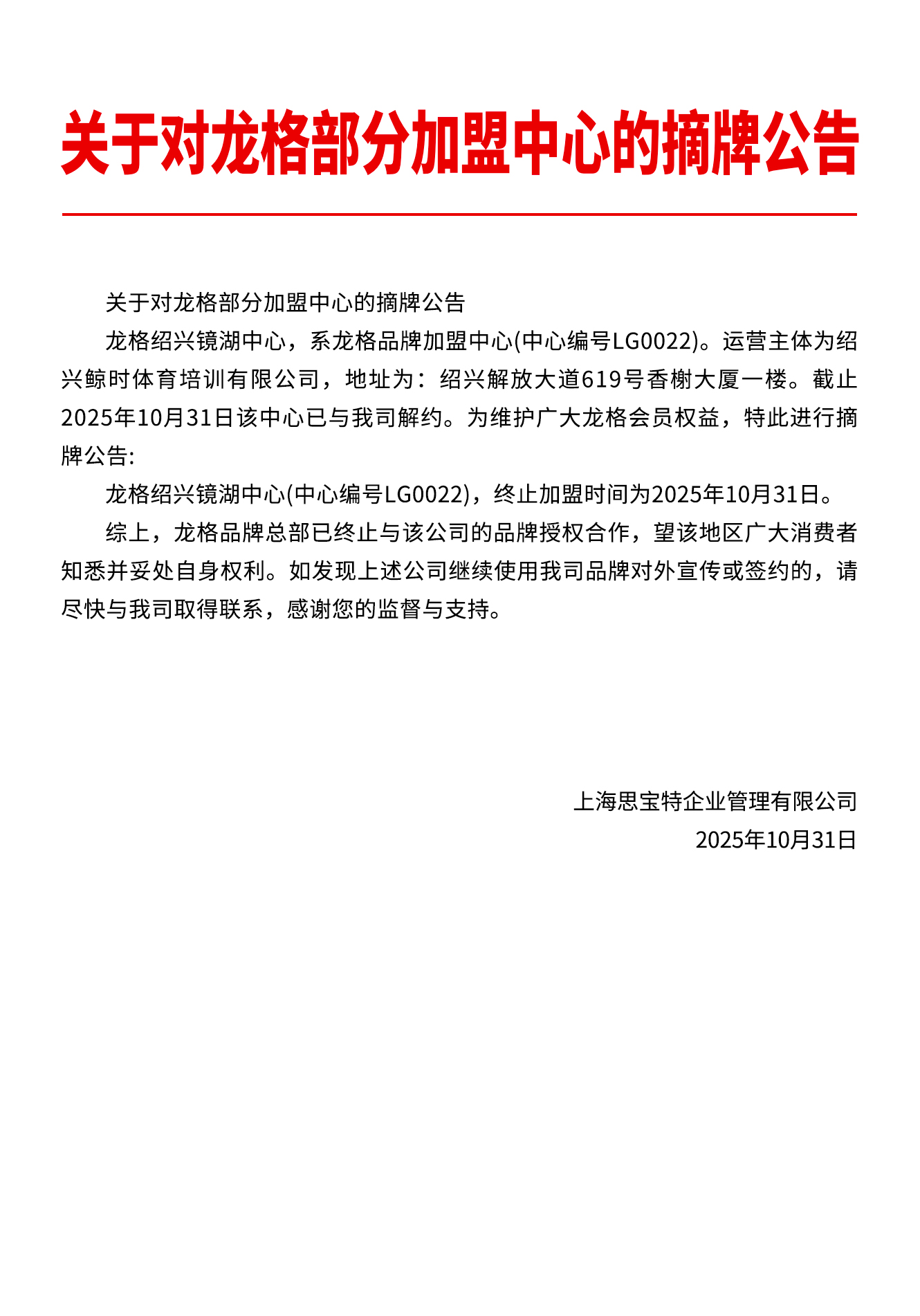 近期,经龙格亲子游泳俱乐部总部排查,发现部分加盟中心与总部已终止加盟关系,但仍在使用龙格亲子游泳俱乐部品牌进行运营。为维护广大龙格会员权益,特此进行摘牌公告: